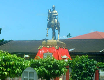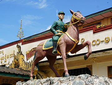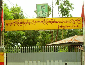 スーチー邸の正門の上にはスーチーさんの父親のアウンサン将軍の写真が掲げられています。