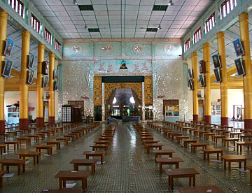 参拝者は入口で靴を脱いでから上がり、カラフルなタイルの敷かれた階段を上がると目の前に現われます。