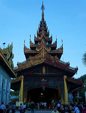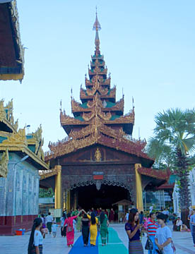 長い参道を抜けると、黄金の何層にも重なるミャンマー様式の屋根を持つきらびやかな礼拝堂があり、さらに進むと天に向かってそびえる巨大なパゴダが現れます。
