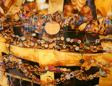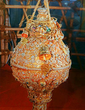 仏像の枕部はモザイクで綺麗に装飾された千両箱のようなものが積み重ねられています。千両箱というより玉手箱かも?