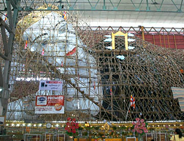 中に入るとその大さに圧倒されます。全身を見るには大きすぎて、1枚の写真には納められません。屋根を支える金属製の柱は何とかならなかったのかと思ってしまいますが、寝釈迦像は当然信仰の対象としての仏様なのですから、巨大な寝釈迦像を護るには巨大な建物が必要なのかと。