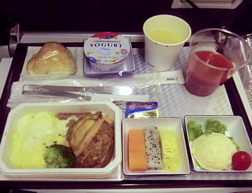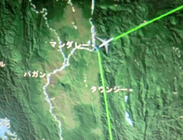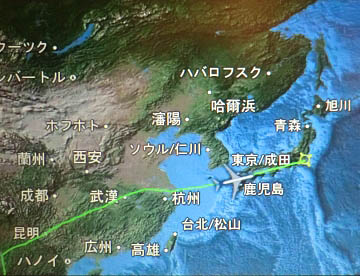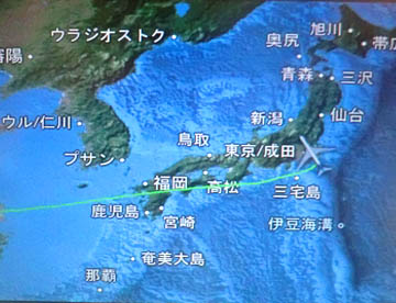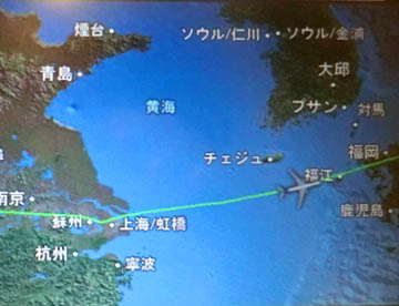 往路とは違ってミャンマー上空を北上してマンダレー上空を通り、中国上空を飛び続け上海の北から黄海へと抜け、九州上空を通過するころに朝食が出て、午前6時15分に成田空港に到着。