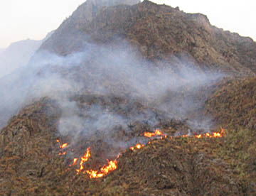 車窓に「デイゴ」の赤い花や山焼きの炎を眺めながら、午後6時に「オリヤンタイタンボ」駅に戻り、バスで「クスコ」に戻って今日の観光は終わり。