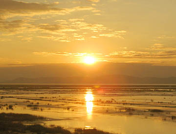 9月10日 ちょうど朝食のレストランの窓から、チチカカ湖の彼方から朝日が昇るのが見られた。