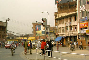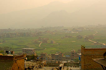 カトマンズ盆地を一望出来る丘の上に建てられていて、土ぼこりにかすんだ市街が見下ろせる。