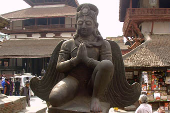 ネパール最古の建物でカトマンズの語源になった・カスタマンダブ寺院、大きな石のガルーダに見守られている・ラクシュミ・ナラヤン寺院、階段ピラミッドのような・マジュ・デガ等々・・・・・ちょっと不釣合いな感じのするのは王宮の西欧風の白い建物。