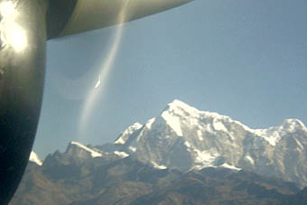 スカイライン航空の小型機は遅れることなく、モヤっと霞んだカトマンズを7時15分に離陸、山を一つ越えた途端に青空が広がっていた。遠くには雪を頂いた山々も見える。