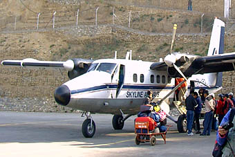 40分位の飛行でルクラに到着。標高6,187メートルのコンデ・リと石楠花の花が出迎えてくれた。