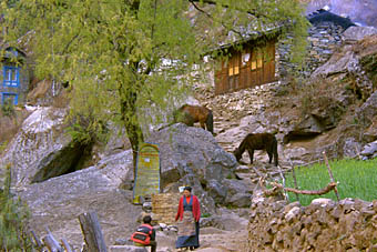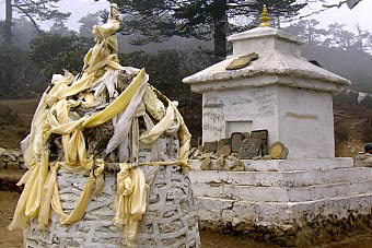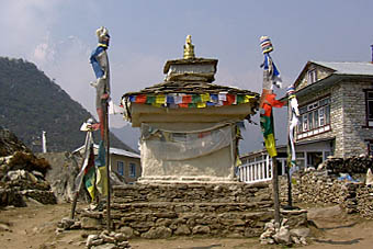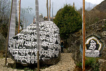 川沿いのゆるやかな道をタムセリクやクンビラ、クスムカンガル等の姿を木の間越しに見ながら、マニ石やマニ車の道を進む。