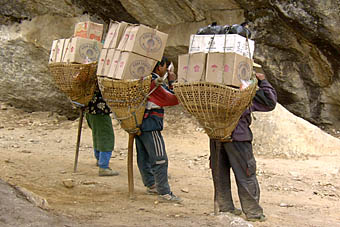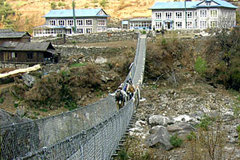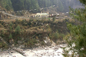 はるか高い所に架かる吊り橋を見上げての休憩の後、その吊り橋を渡ってから、ナムチェ・バザールまでの標高差590メートルの急な長くきつい登りが始まる。