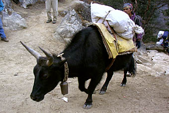9時30分に大きな荷物はポーターに預けて(我々一行の荷物はヤクと牛の交配で生まれたゾッキョの背中で運ばれる)、ロッジや商店などが並ぶルクラの街を通り抜けいよいよトレッキング開始。