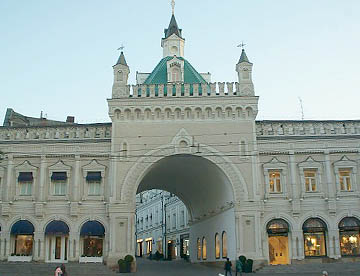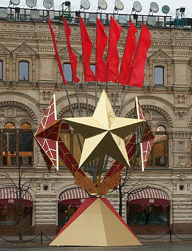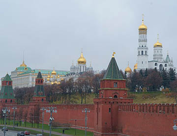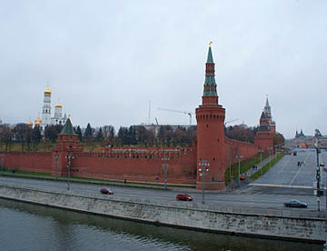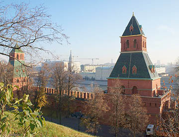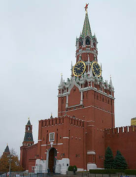 クレムリンを囲繞する20の尖塔。1937年のロシア革命20周年を記念して、トロイツカヤ塔、ホロヴィツカヤ塔、ヴォドヴズヴォドナヤ塔、スパスカヤ塔、ニコリスカヤ塔の先端には、ウラル山脈から採掘されたルビーで作られた直径3メートルになる赤い星(クレムリンの赤い星)が輝く。
