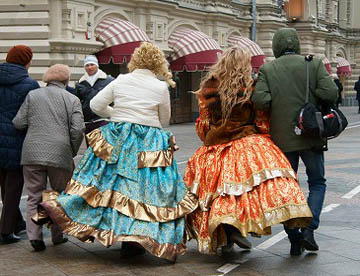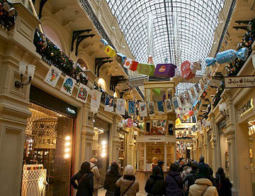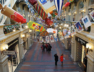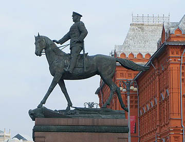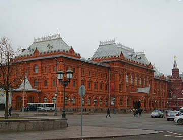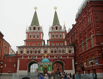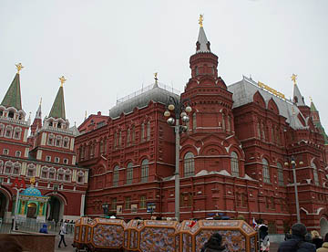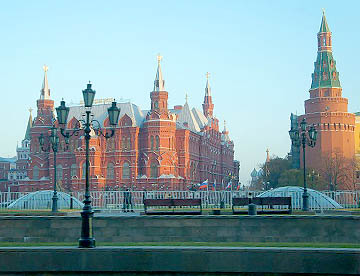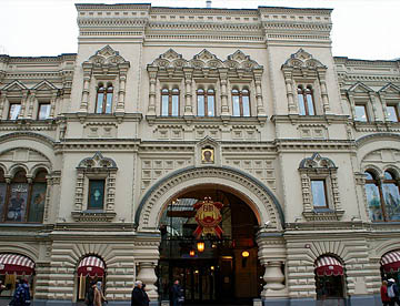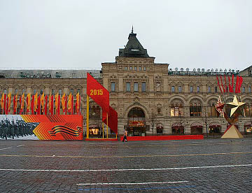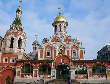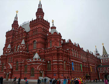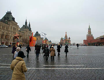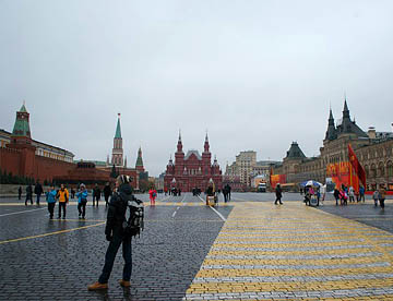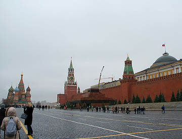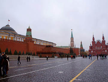 国立歴史博物館から入るとすぐ右手にカザン大聖堂、その先は左手に細長いグム(ショッピングセンター)とレーニン廟に挟まれた幅は130m長さ700m反対側の正面に聖ワシーリー寺院までの広大な広場が赤の広場。