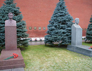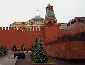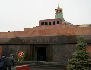 赤の広場に面して赤い石で造られた落ち着いた感じの建物がレーニンの眠る「レーニン廟」です。長い行列に並んで中に入れます。入り口は黒い大理石で、花が飾られ衛兵が守っています。内部は薄暗く、写真撮影は禁止です。