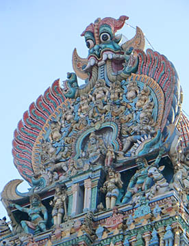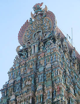 特にミナークシー寺院のゴープラムは「おもちゃ箱をひっくり返したような」と形容される、全面を埋め尽くす極彩色のおびただしいヒンドゥーの神々や動物たちの像、多神教のヒンドゥーとインドを象徴するカオスな小宇宙です。