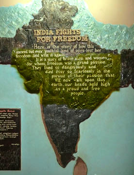 17世紀からのヨーロッパの植民地支配、特にイギリスへの絶え間ないインドの抵抗の歴史がわかるように、ガンディーの写真とタミル語と英語で書かれた説明ボードが何枚も。