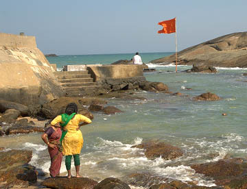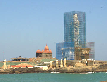 片方の岩には赤っぽい建物が建っています。ここに19世紀末のヒンズー教の宗教改革者ヴィヴェーカーナンダが訪れたことで記念館が建てられています。ヒンズー教徒にとって聖地のようなところのようで、今も多くの人がこの記念堂を訪れています。