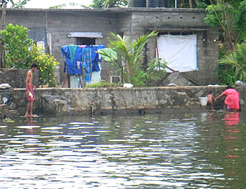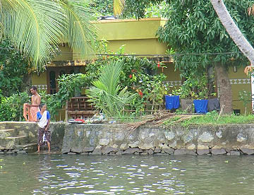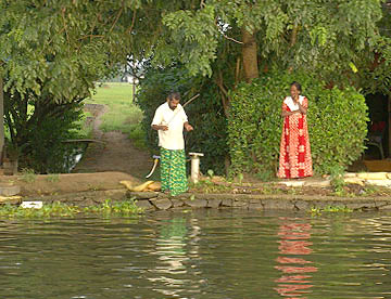 川岸には、多くの椰子の木やバナナなどの南国の植物が立ち並び、民家もちらほらと見られ、のんびと釣り糸を垂れている人や、洗い物をする姿等そこに住む人々の生活を垣間見ることができます。