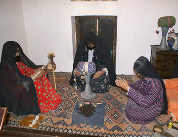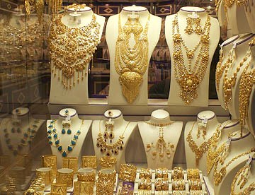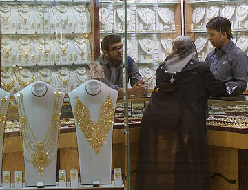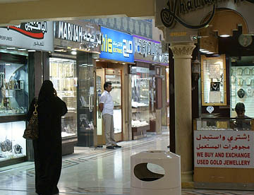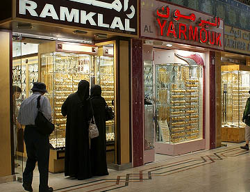 でも目を引いたのは金製品を扱う店。建物の1階の中央部分は金製品の店で占められていて、真っ黒な民族衣装・アバヤを着た女性が熱心に品定めをしている。