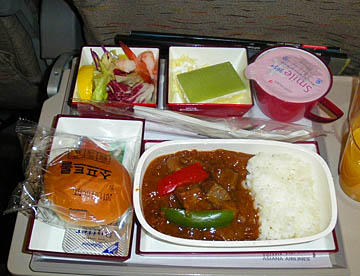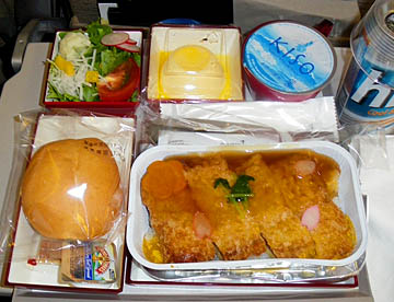 機内サービスでは昼食にカツ丼が出たが肉が硬くあまり美味しくなかった。