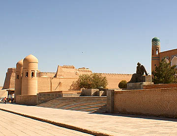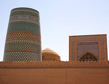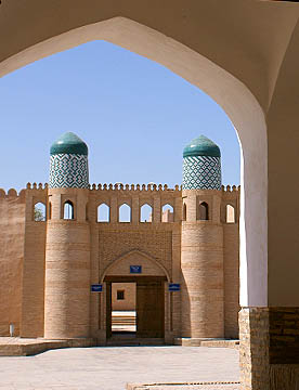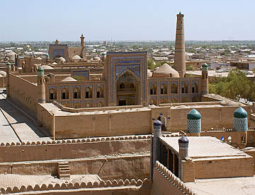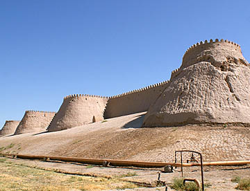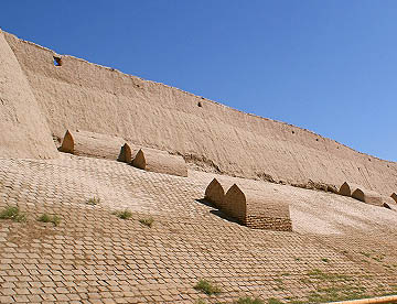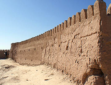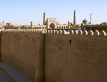 二重の城壁に囲まれたヒワ内城(イチャン・カラ)。シャヒリザーダホテルのある二重の城壁の内側は中世のオアシス都市がそっくり保存されて世界遺産に登録されたタイムスリップしたような地域。