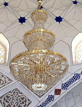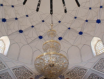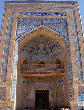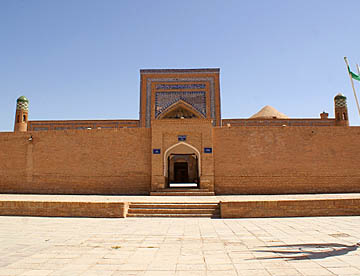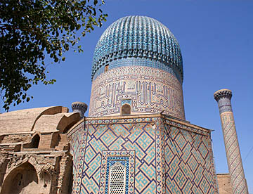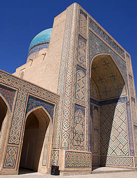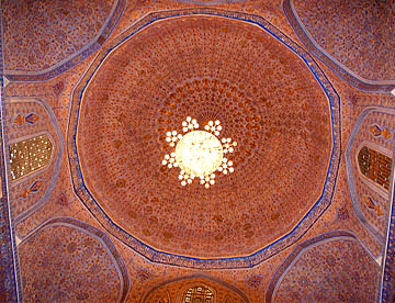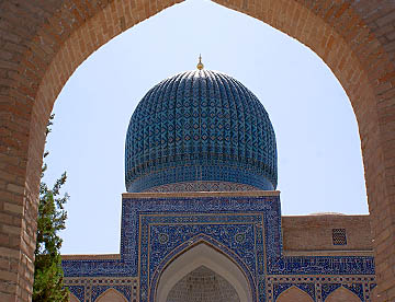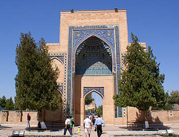 ブハラから空車で回送されたバスがまだ着いていないので代わりのバスでティムール一族の眠るグル・アミール廟を見学。大きく立派な廟で黄金に輝く内装は華やか。中に入ると涼しくゆっくりと観光。