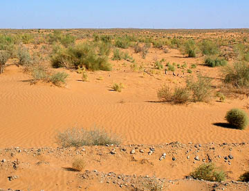 砂漠といっても殆んど植物の生えていないサハラ砂漠のような風景とは異なって、サフサオール(ラクダ草)やヤンタックと呼ばれる草、所々にはピンク色の花も見られる。