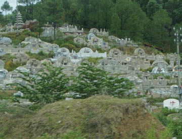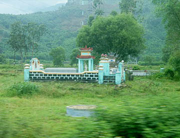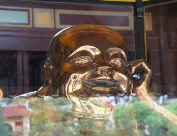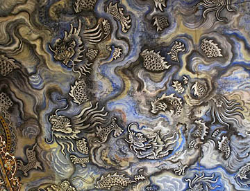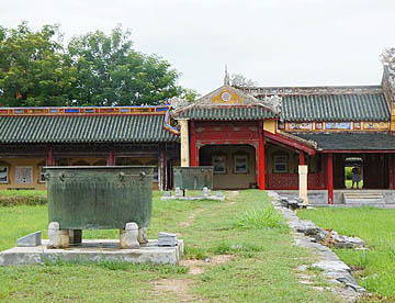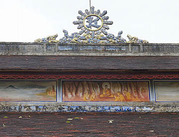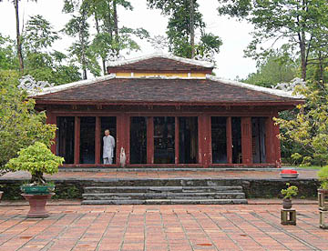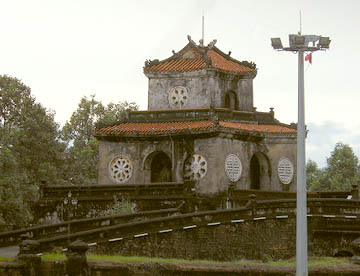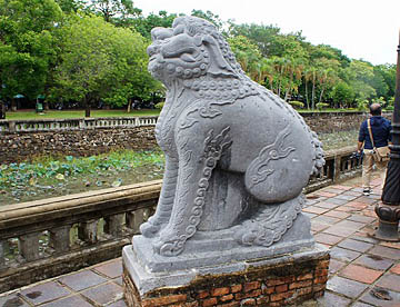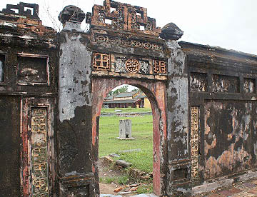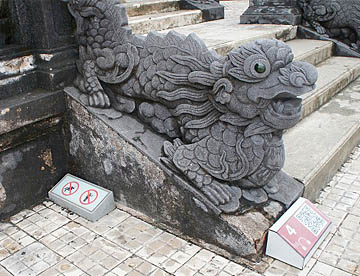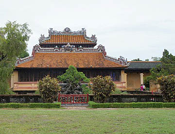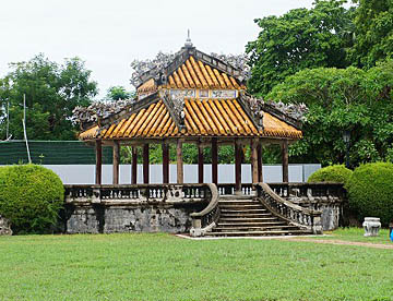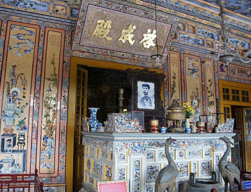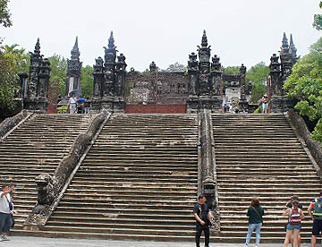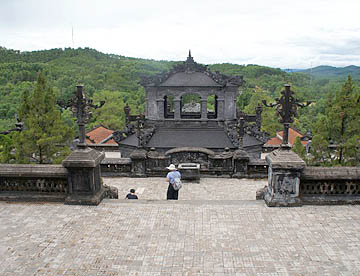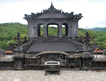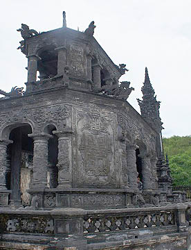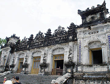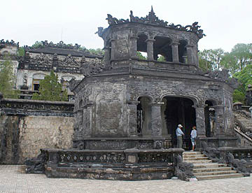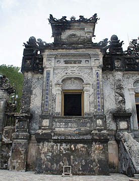 フランスに傾倒し、住民の税金を上げたり派手好きだったとされる第12代カイ・ディン帝の墓所です。歴史上ではあまりイメージの良い皇帝ではなかったようですが、皇帝の考案した帝廟のデザインは斬新で、無宗教だったこともあって、仏教的な要素やキリスト教的な要素、イスラム風な装飾や西洋風のきらびやかな装飾等が混在しています。装飾や石像などに使われている陶磁器やガラスは中国や日本からの輸入品です。