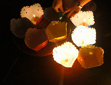 長い竿の先に、ローソクの灯りをともしたランタンをひっかけて川に浸けた後、ゆっくりと流れていく姿にはしばし喧噪を忘れさせてくれます。