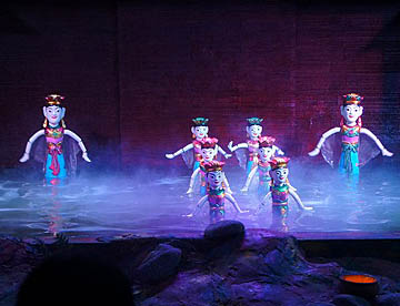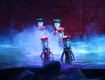 それぞれのテーマに沿って、民話、習慣、伝説、民族的な話などが、ベトナム伝統楽器の軽やかな音色とともに、水中で操られる愛くるしい顔の人形達によって綴られてゆく。言葉がわからなくても、そのコミカルで繊細な人形の動きには見入ってしまい、大まかなストーリーは理解できる。。