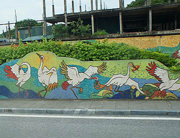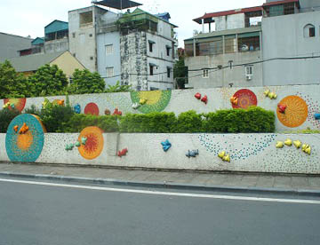 バッチャン焼きのタイルを使用した壁画には様々なベトナムの歴史が描かれています。